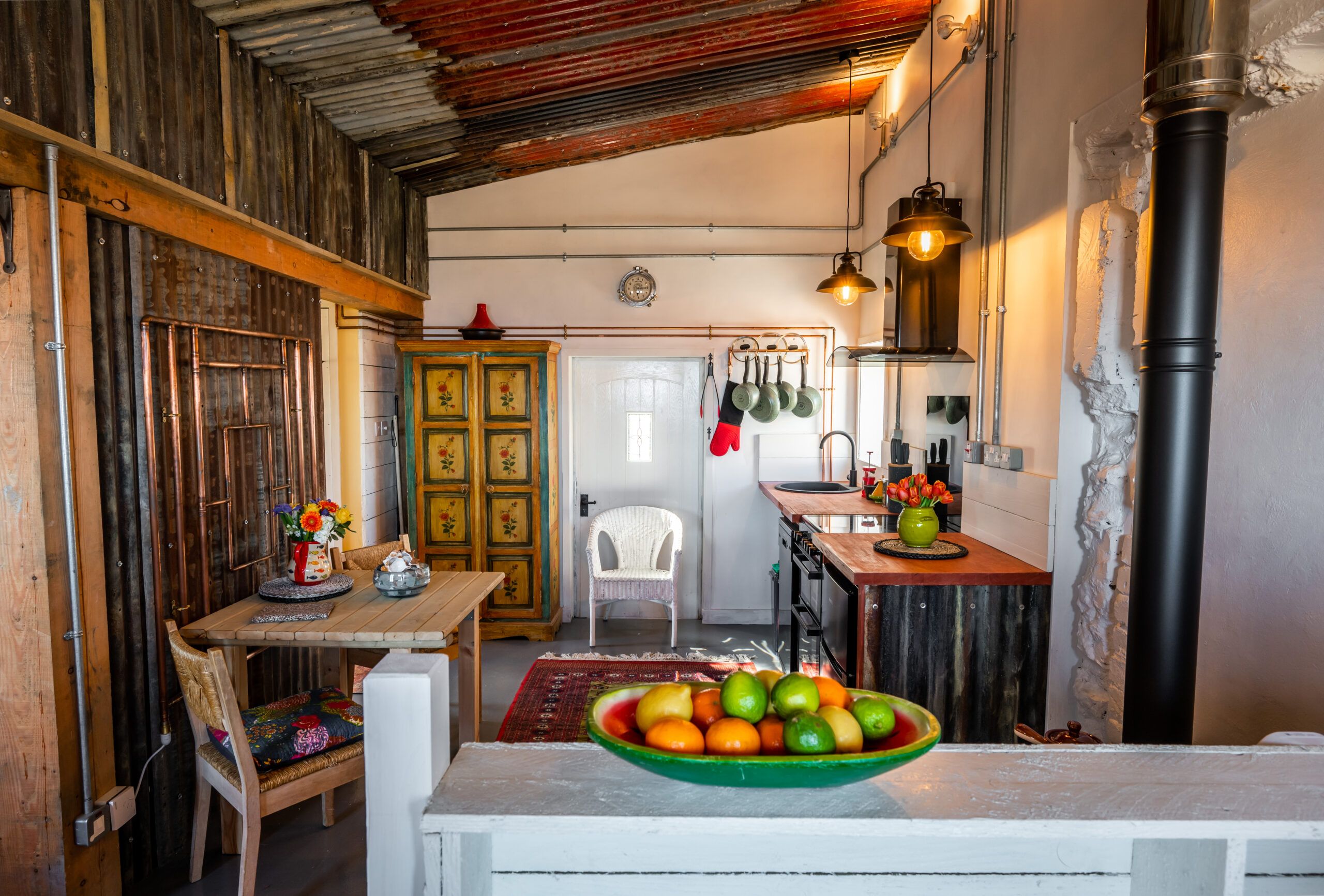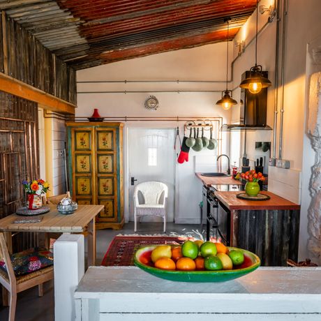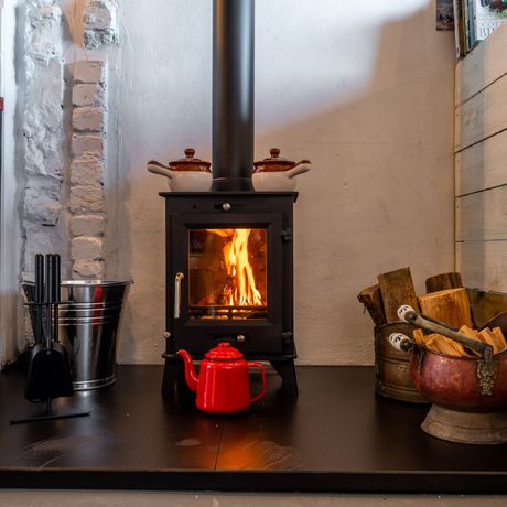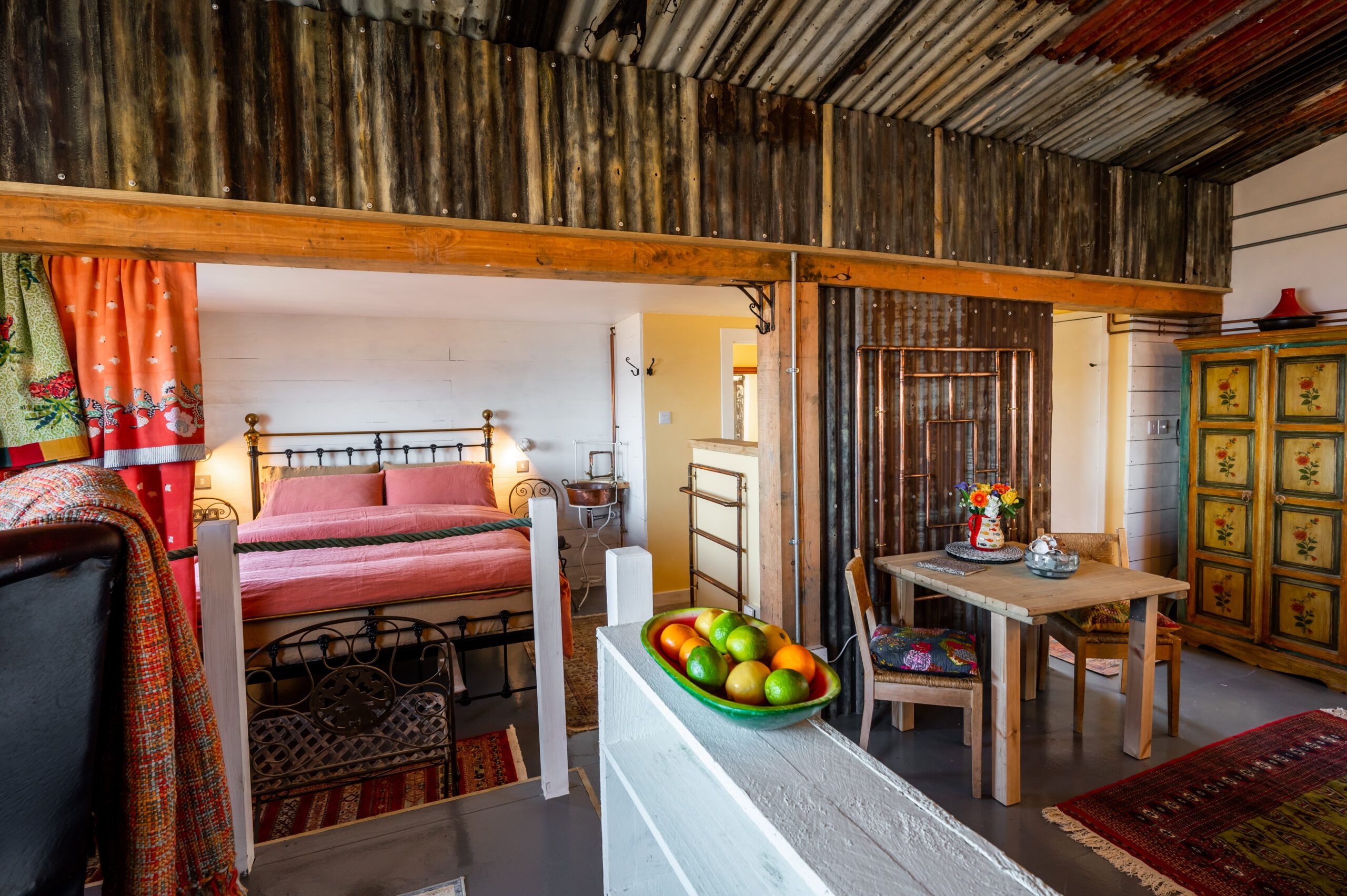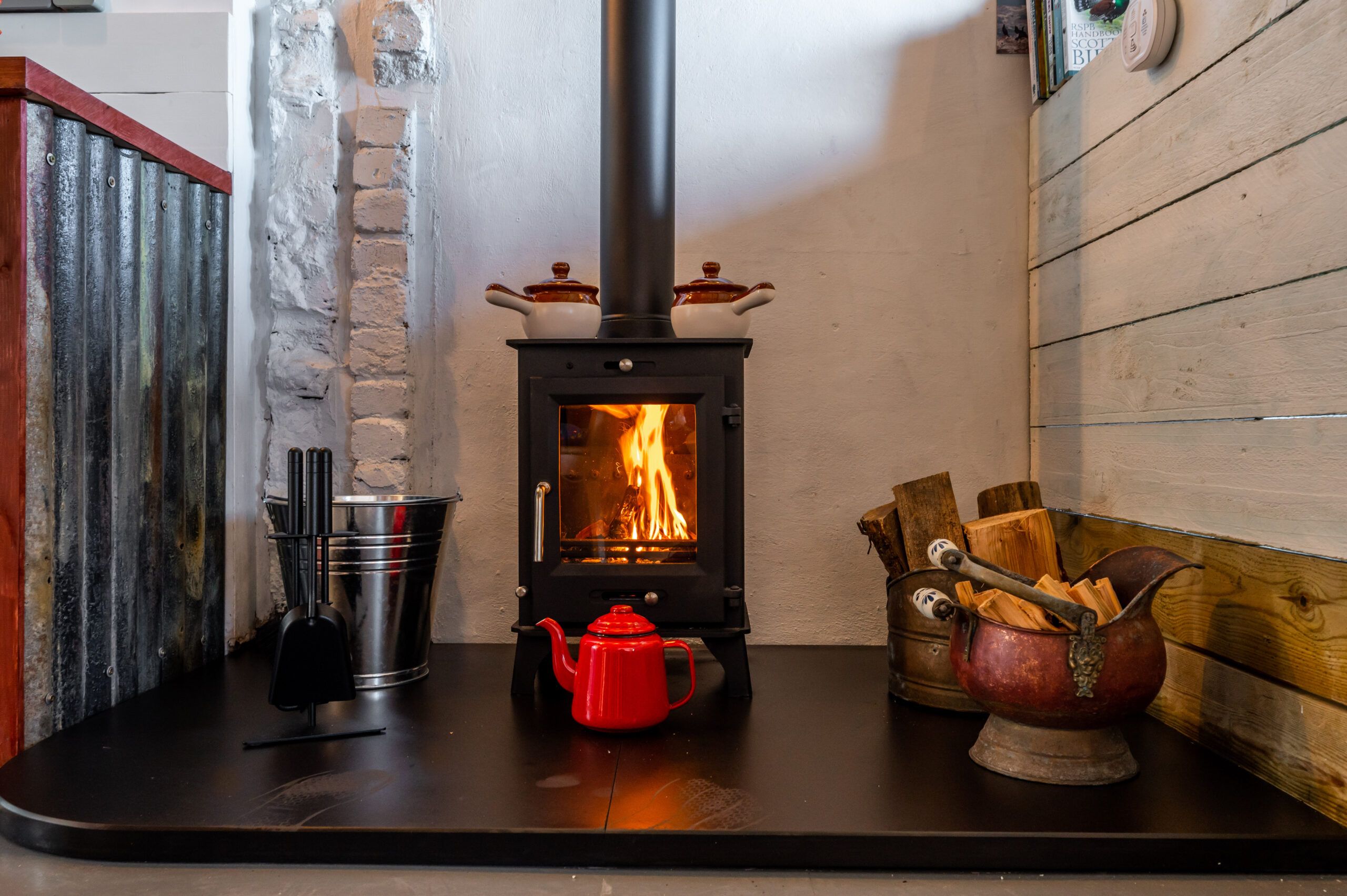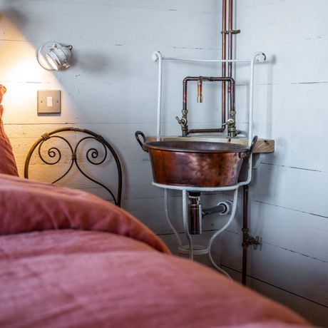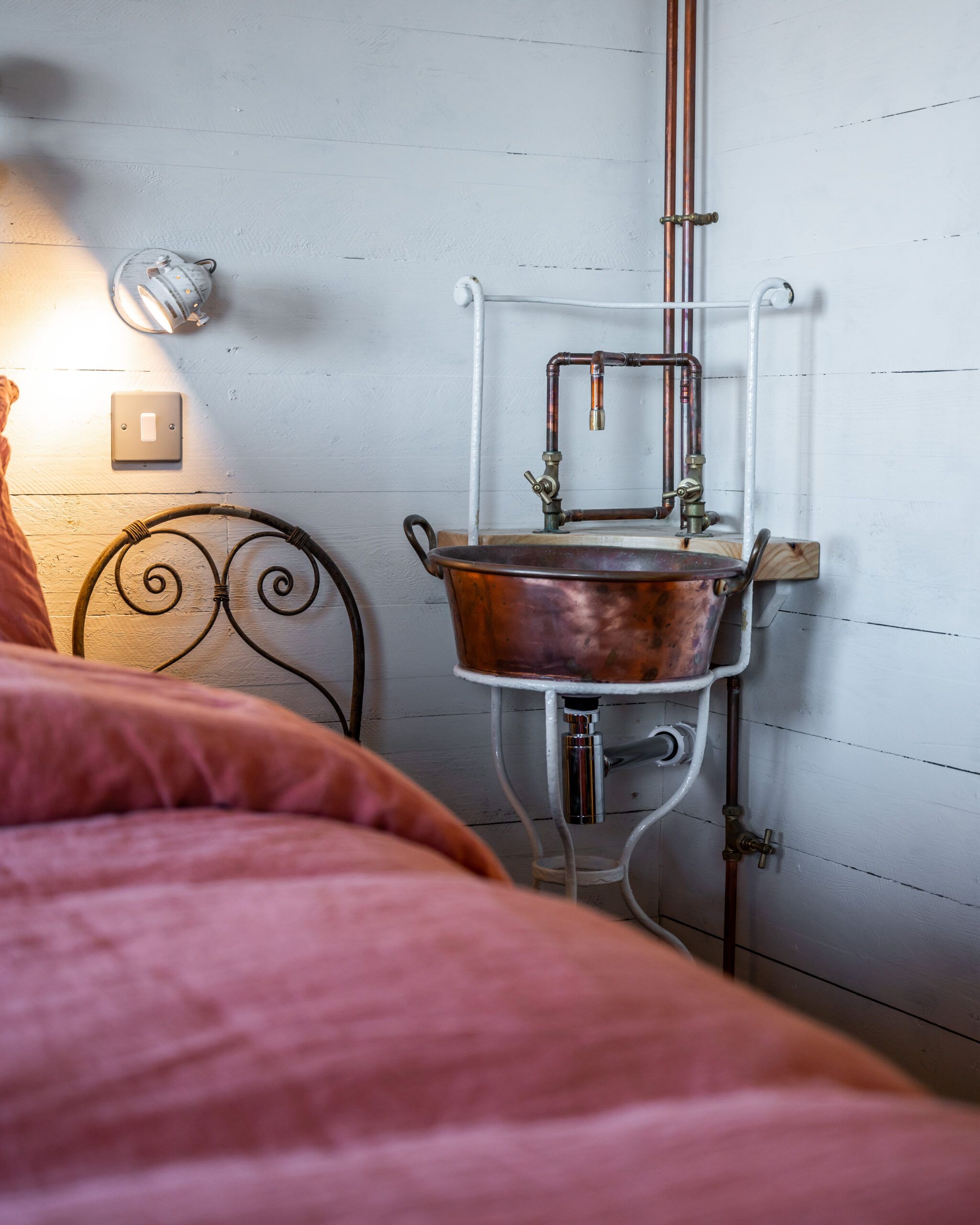 King-sized bed with sumptuous Portuguese linen sheets; two deep snug armchairs on a raised deck at the panorama window; a galley kitchen; a large rainwater shower; bespoke copper radiators; a wood-burning stove.